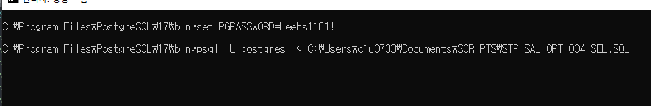 다음 명령으로 SQL 파일을 실행합니다.set PGPASSWORD=your_passwordpsql -h your_host -d your_database -U your_user -f your_script.sql - 배치 파일 작성: