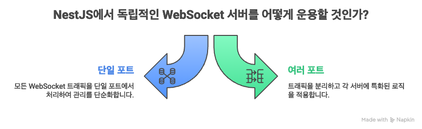 안녕하세요! NestJS를 사용해 HTTP 포트(3000번)와는 별개로 두 개 이상의 독립적인 WebSocket 서버를 운용하는 방법을 찾고 계시는군요.