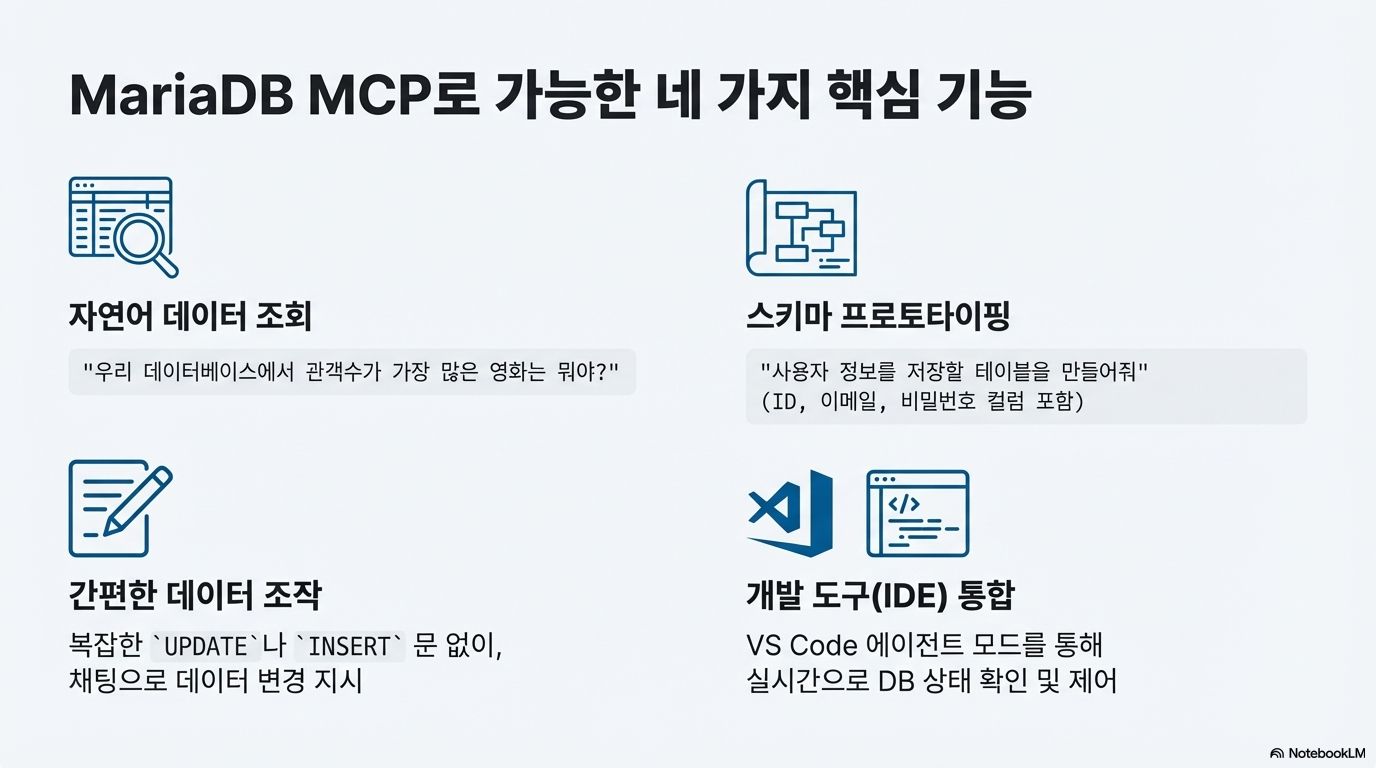 데이터베이스 관리와 스키마 설계 방식이 완전히 변화하고 있습니다. MariaDB에서 공식적으로 제공하는 MCP(Model Context Protocol) 서버를 활용하면, SQL 쿼리를 직접 작성하지 않고도 AI 모델을 통해 데이터베이스를 조작하고 정보를 조회할 수 있습니다.