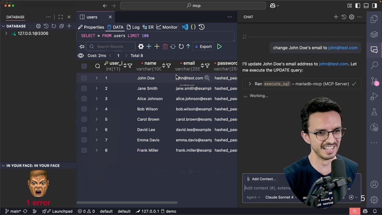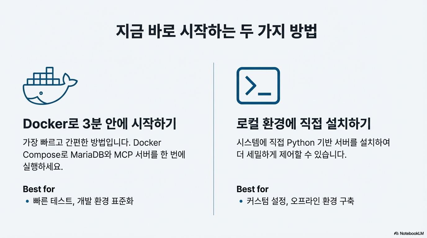 MariaDB MCP 서버는 파이썬 기반으로 구현되어 있으며 Docker를 통해 간편하게 실행할 수 있습니다. Docker Compose를 사용하여 MariaDB 서버와 MCP 서버를 동시에 띄운 후, VS Code의 MCP 확장에서 해당 서버의 URL을 등록하기만 하면 대화형 DB 관리 환경이 완성됩니다. [02:50], [05:03]