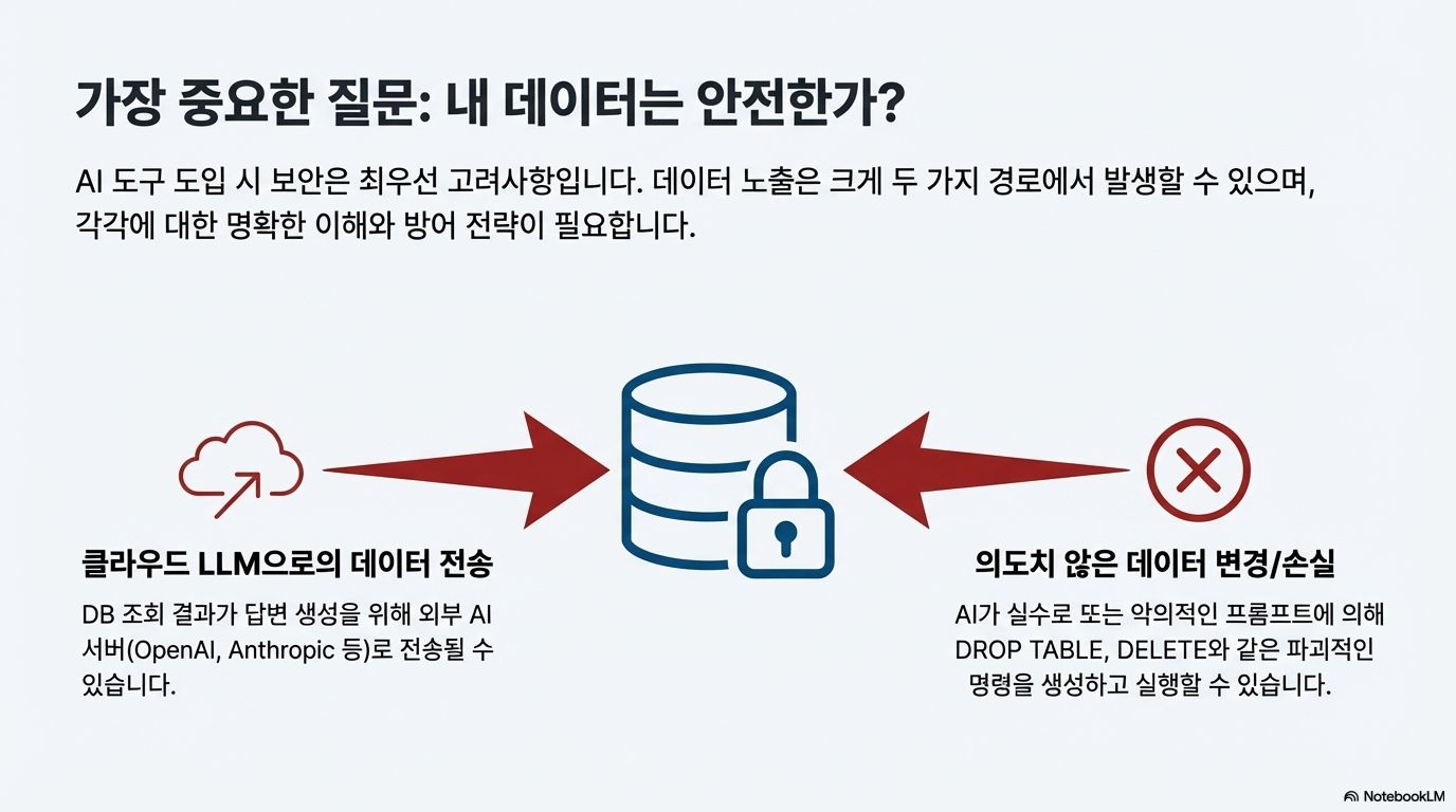 - 클라우드 LLM으로의 전송: ChatGPT나 Claude와 같은 클라우드 기반 AI를 사용하면, 데이터베이스에서 조회한 결과가 답변 생성을 위해 외부 AI 회사 서버로 전송될 수 있습니다.
