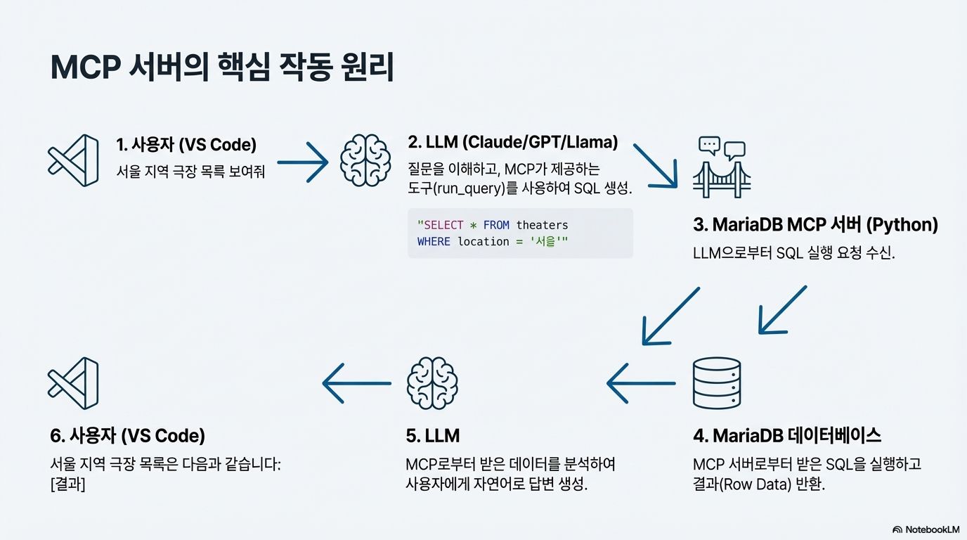 - [MCP 서버 ↔ DB] 명령 전달 및 결과 수신 '심부름꾼'인 MCP 서버가 직접 MariaDB 데이터베이스에 접속해 AI로부터 받은 SQL 명령을 실행하고, 그 결과(극장 목록 데이터)를 받아옵니다.