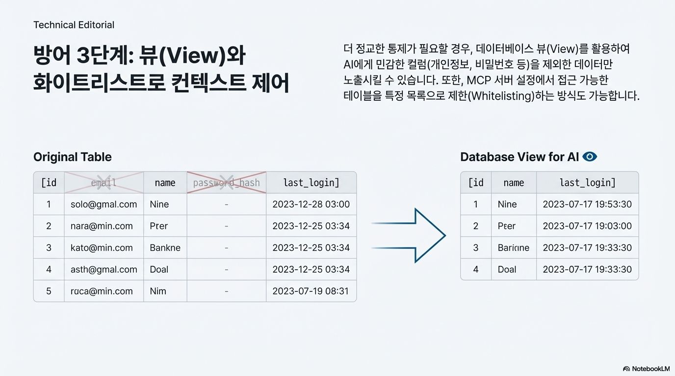 MCP 서버 설정에서 접근 가능한 테이블을 명시하거나, 민감한 개인정보 컬럼(예: 사용자 이메일, 비밀번호)은 AI가 보지 못하도록 뷰(View)를 만들어 제한적으로 공개하는 방식을 취합니다.