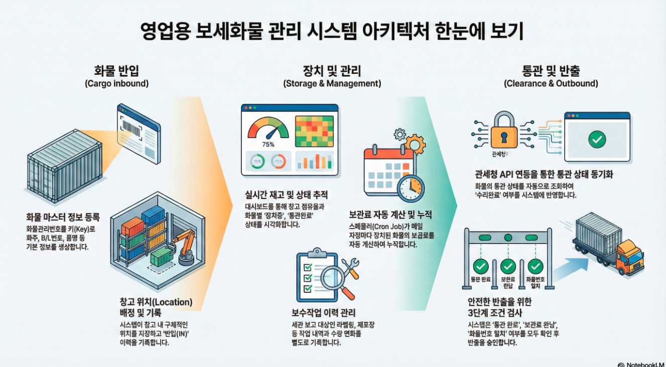 보세구역 화물관리는 일반 WMS에 통관 상태 추적과 보관료 정산 로직이 결합된 형태입니다.