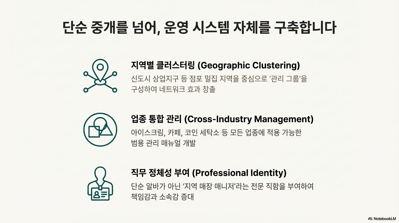 - 전문 인력 양성 및 브랜드화: '지역 매장 매니저'라는 전문 직무를 체계적으로 교육하고 양성하는 시스템을 구축할 것입니다. 이는 서비스 품질을 상향 평준화하는 가장 확실한 방법이며, "우리 플랫폼에 맡기면 대기업 직영점 수준으로 관리된다"는 강력한 신뢰를 시장에 각인시키는 역할을 합니다. 결국, 잘 훈련된 매니저 자체가 플랫폼의 가장 강력한 브랜드 자산이 되는 선순환 구조를 만들 것입니다.