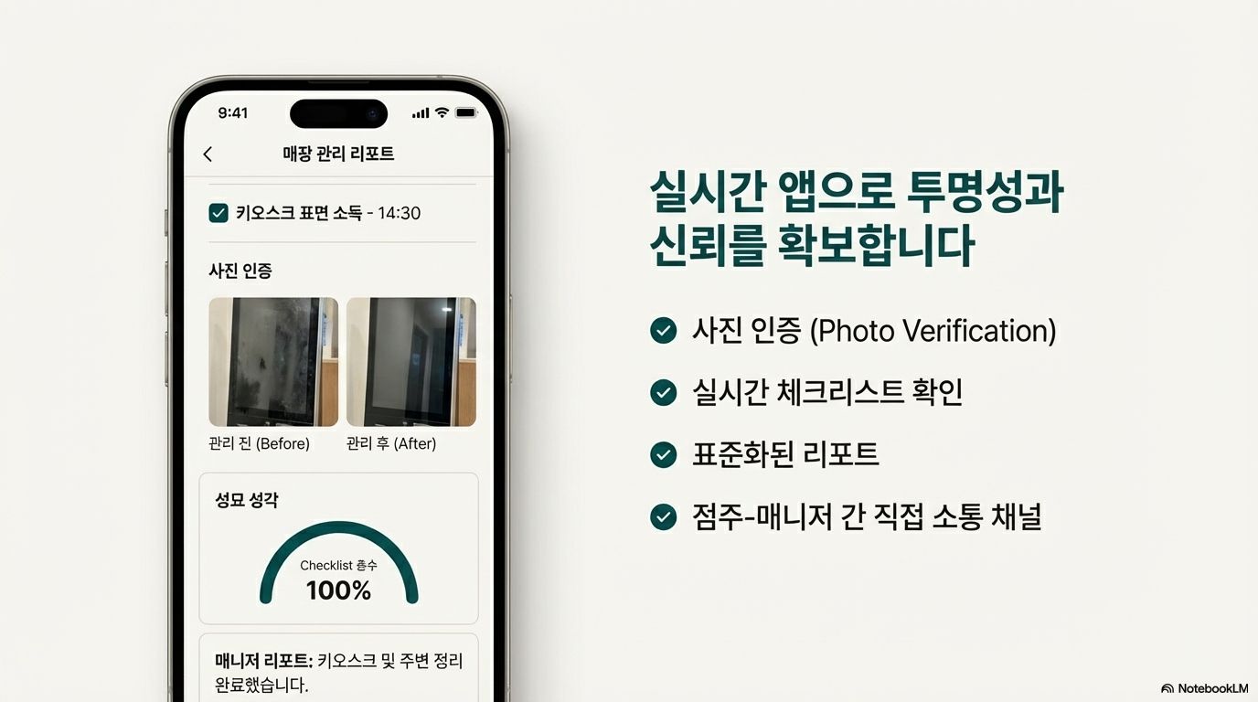 점주들은 더 이상 CCTV만 바라보며 불안해할 필요가 없습니다. 저희의 IT 시스템은 '사진 인증'과 '체크리스트 확인' 기능을 통해 매니저의 모든 관리 활동을 투명하게 공유합니다. 이는 점주에게 물리적 해방을 넘어 심리적 안정감을 제공하며, 플랫폼에 대한 깊은 신뢰를 구축하는 기반이 됩니다.