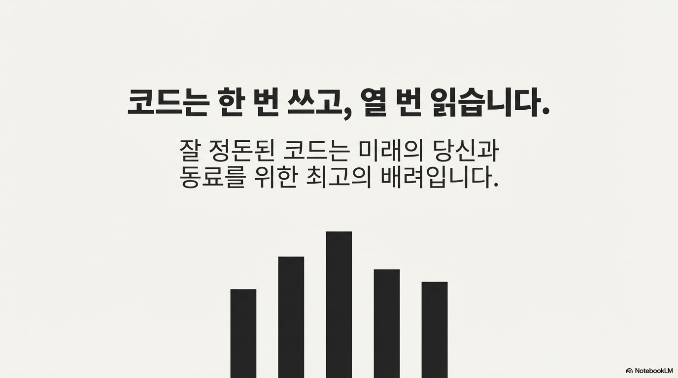 오늘 배운 원칙들을 꾸준히 연습하여 여러분만의 깔끔한 코드 스타일을 정립해보세요. 명확하고 아름다운 코드를 작성하는 개발자로 성장하며, 팀의 코드 품질과 협업 문화를 한 단계 끌어올리는 데 기여하시기를 응원합니다!