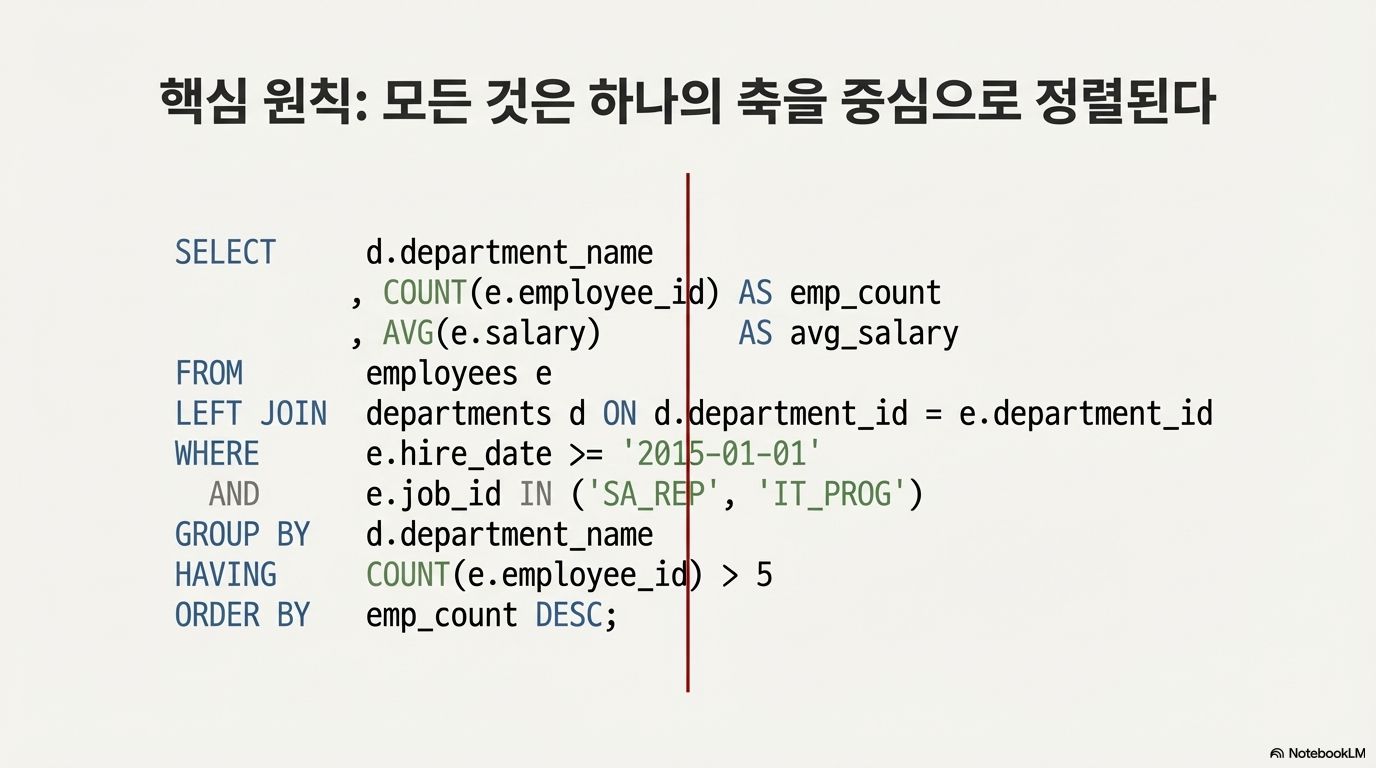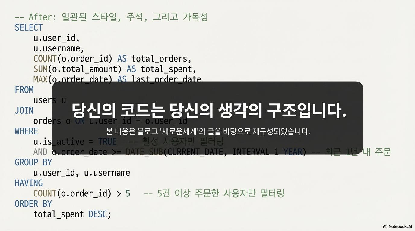 - 줄 바꿈으로 계층 표현 SELECT, FROM, WHERE, GROUP BY 등 주요 절(Clause)은 각각 새로운 줄에서 시작하여 논리적인 단위를 명확하게 구분합니다. 이를 통해 쿼리의 실행 흐름을 쉽게 따라갈 수 있습니다.