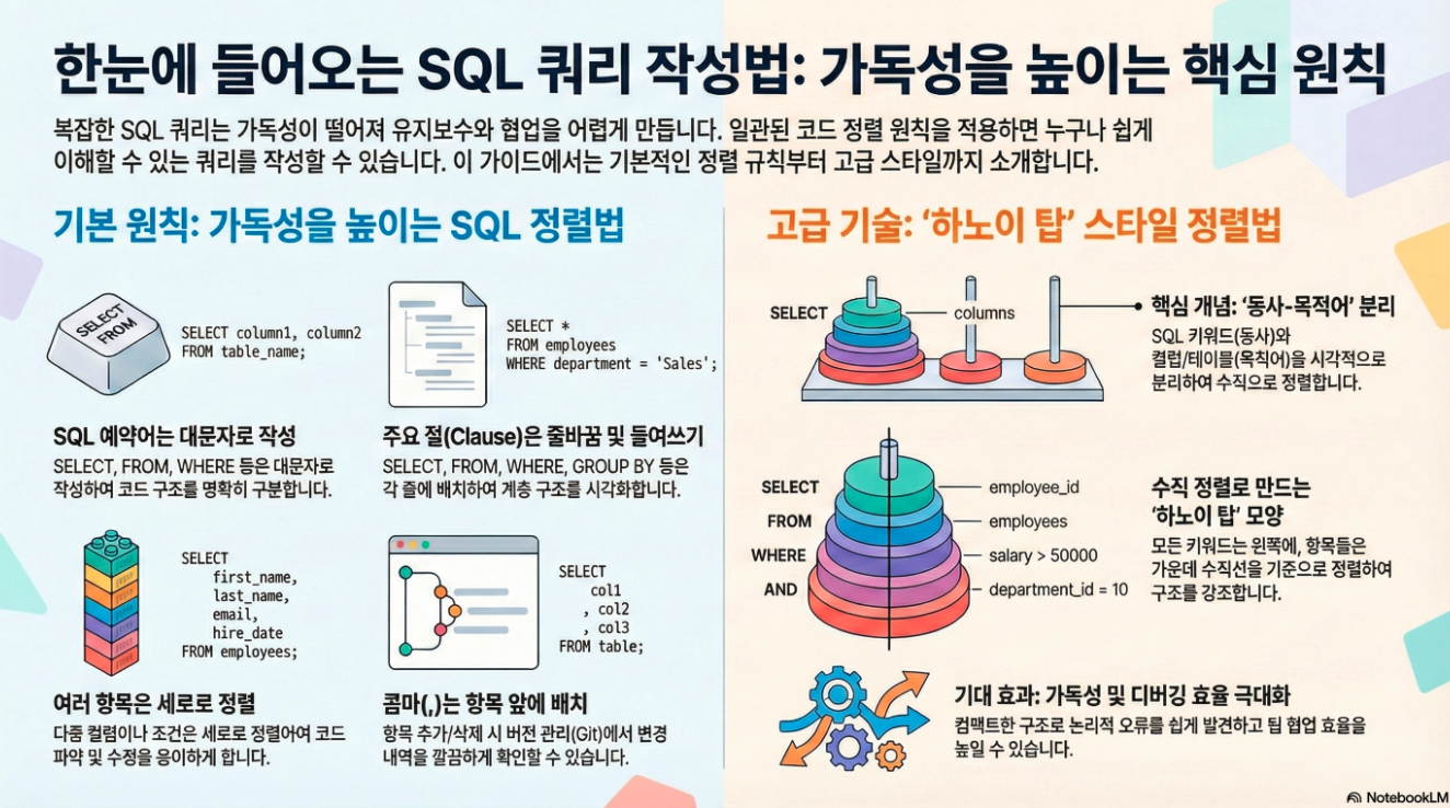 '하노이 탑 스타일'은 이름처럼 독특한 접근 방식을 가진 SQL 정렬 기법입니다. 핵심은 코드의 구성 요소를 역할에 따라 명확히 구분하는 것입니다.