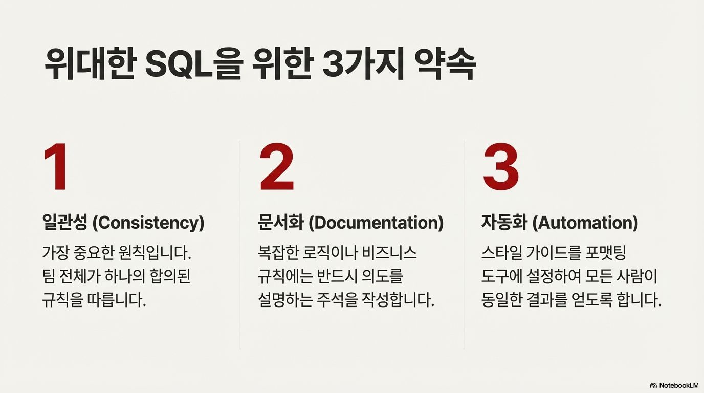 - 일관성 유지 가장 중요한 원칙입니다. 팀 내 합의를 통해 모든 쿼리에 일관되게 스타일을 적용해야 합니다. 여러 스타일이 섞여 있으면 오히려 가독성을 해칠 수 있습니다.