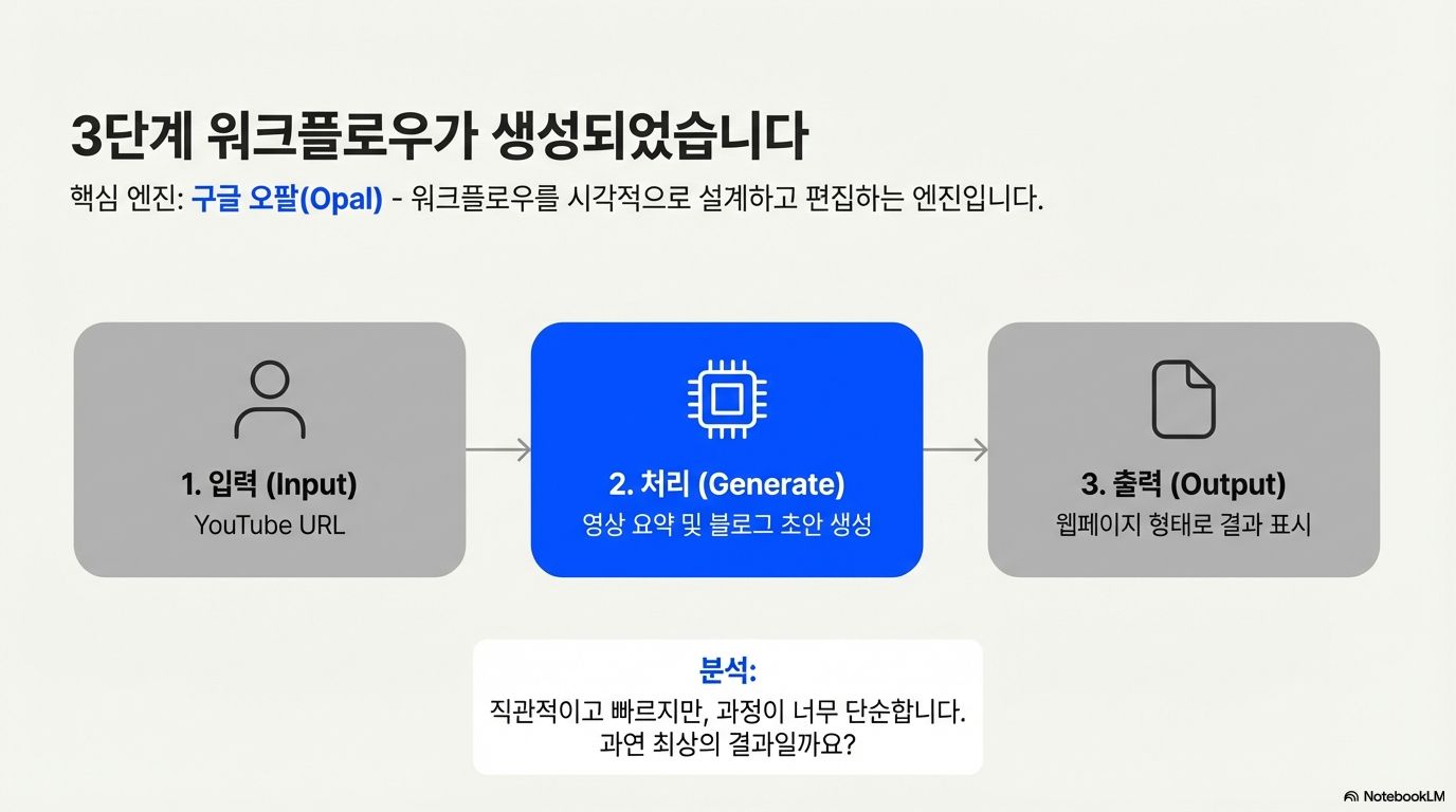 슈퍼잼으로 생성된 워크플로우는 구글의 '오팔(Opal)'이라는 툴을 통해 시각적으로 구현되고 관리됩니다. 사용자는 네모난 모양의 입력(User Input), 파란색으로 표시되는 처리(Generate), 그리고 최종 결과(Output) 단계를 직관적으로 확인할 수 있으며, 각 단계별 세부 지시사항도 볼 수 있습니다.