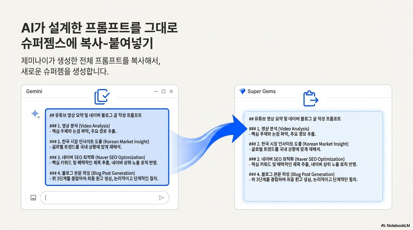 - After (메타 프롬프팅 적용): "네이버 상위 노출 로직을 반영해서 최적화된 블로그 글을 만드는 앱을 위한 프롬프트를 알려줘"라고 먼저 요청했습니다. 제미나이가 제안한 상세한 4단계 구성의 프롬프트를 그대로 슈퍼잼에 입력하자, URL 입력, 요약, 발행의 3단계를 훌쩍 뛰어넘는 총 6단계의 훨씬 정교한 워크플로우가 만들어졌습니다. 작업의 깊이와 정교함이 완전히 달라진 것입니다.