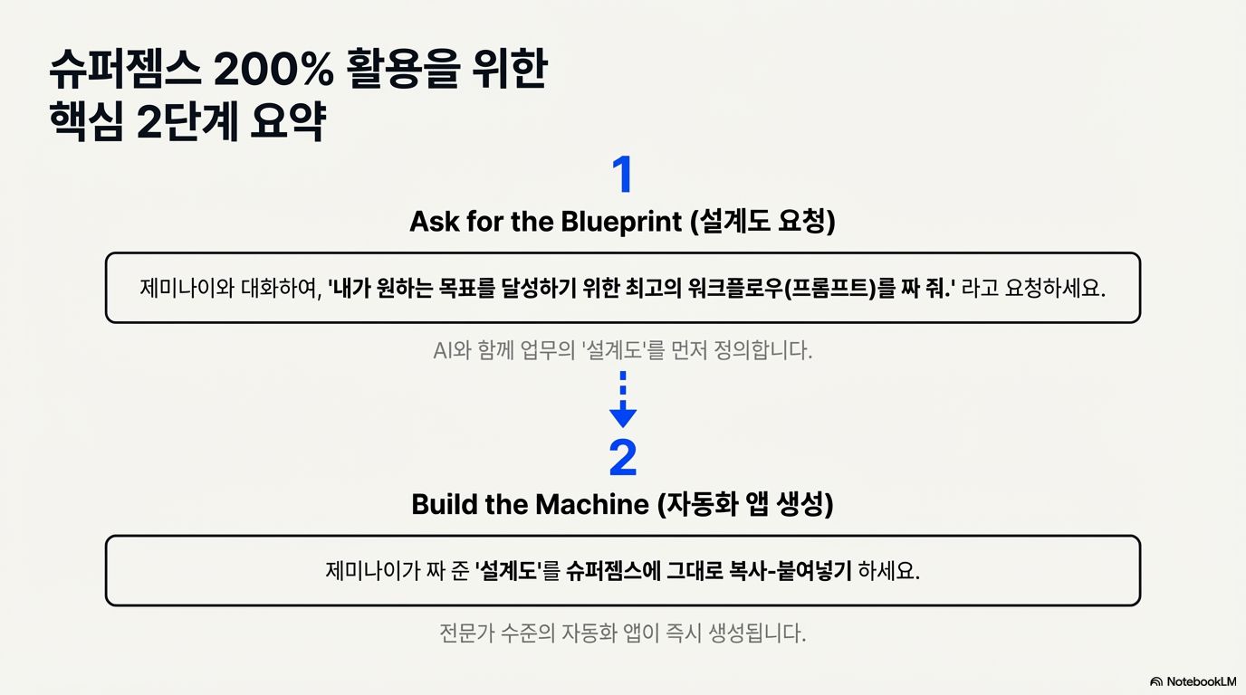 슈퍼잼의 등장은 AI 활용의 패러다임을 '단순 지시'에서 '업무 흐름 설계'로 바꾸고 있습니다. 복잡한 코딩 없이, 제미나이와 먼저 상의하여 최적의 업무 흐름을 정의하고, 그 내용을 슈퍼잼에 입력하는 것만으로 자신만의 자동화 시스템을 가질 수 있습니다.