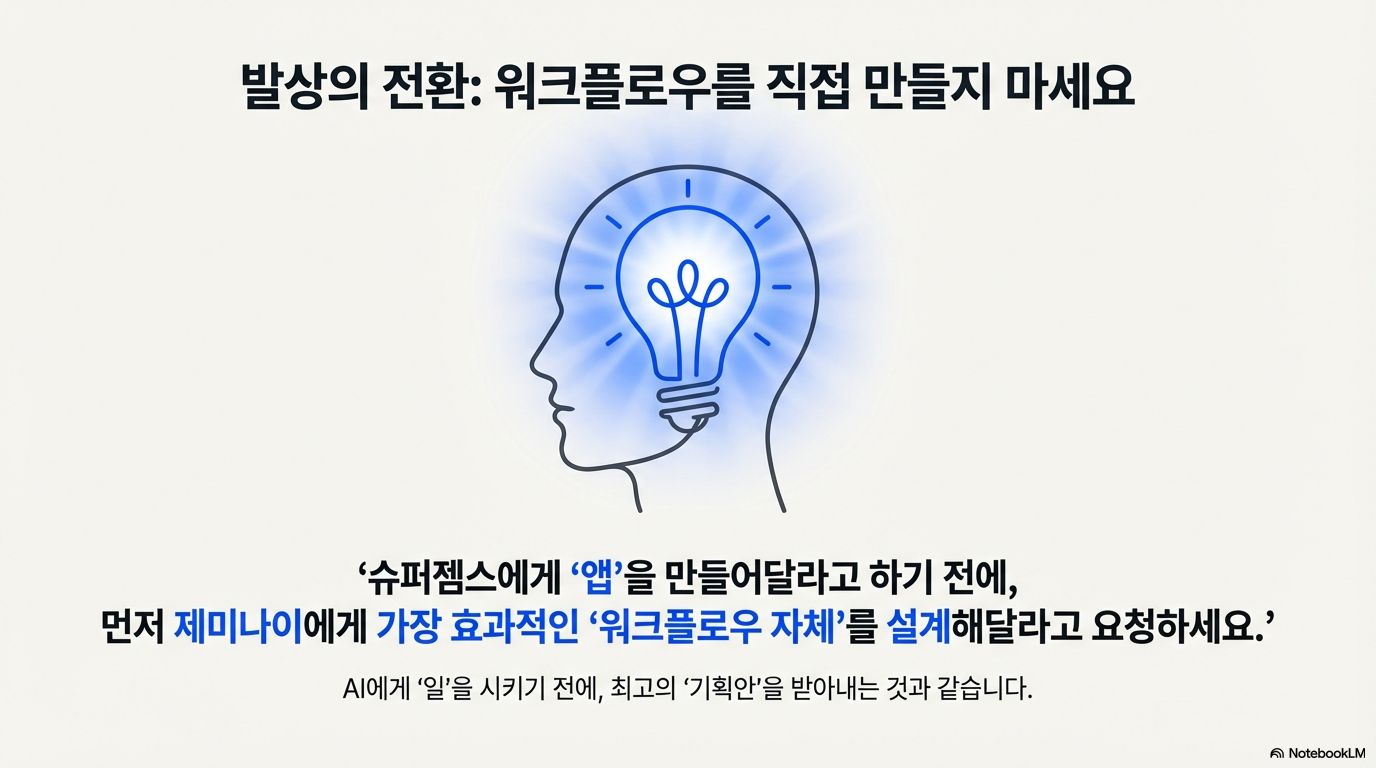 이 문제에 대한 가장 효과적이고 놀라운 해결책은 바로 '메타 프롬프팅(Meta-Prompting)' 기법입니다. 핵심은 AI에게 워크플로우를 직접 만들어달라고 요청하기 전에, 먼저 '최고의 워크플로우 설계자'로서 AI의 컨설팅을 받는 것입니다. 워크플로우를 직접 수정하는 대신, 제미나이에게 역으로 먼저 물어보는 것이죠.