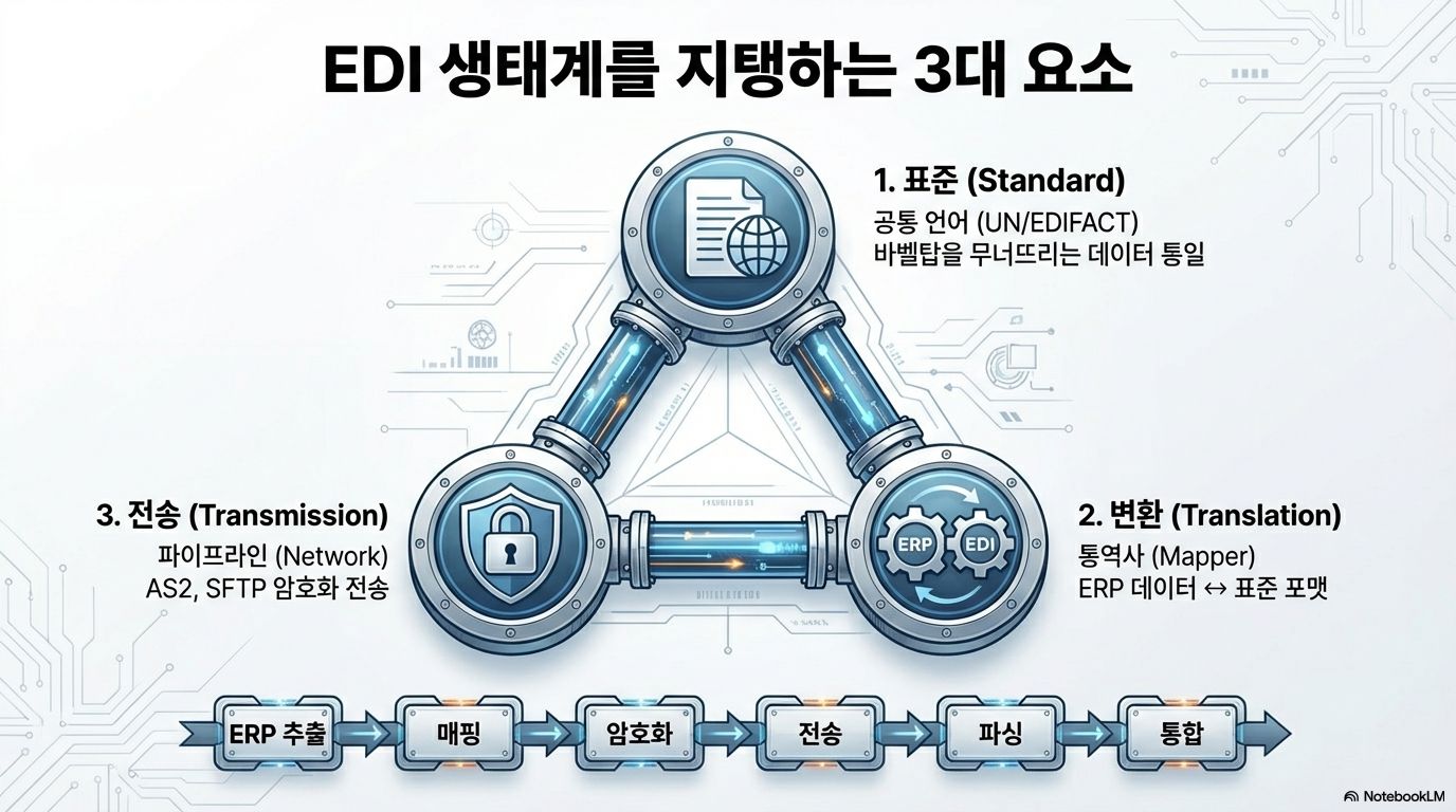 - 전송 네트워크(Transmission): 데이터를 안전하게 실어 나르는 통로입니다. (예: AS2, SFTP, VAN)