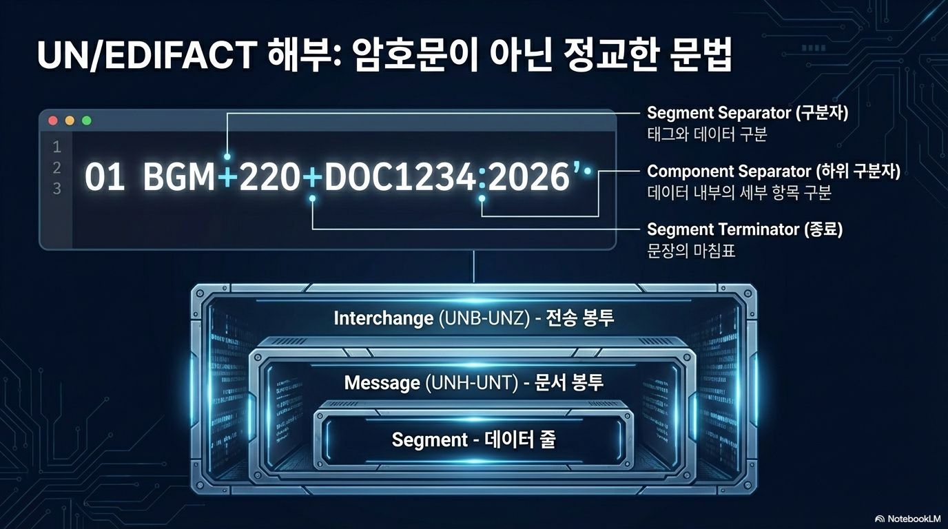 EDIFACT는 단순히 데이터를 나열하는 것이 아니라, 엄격한 **문법(Syntax)**을 따릅니다. 이를 이해하는 것은 마치 외국어의 문법을 배우는 것과 같습니다.