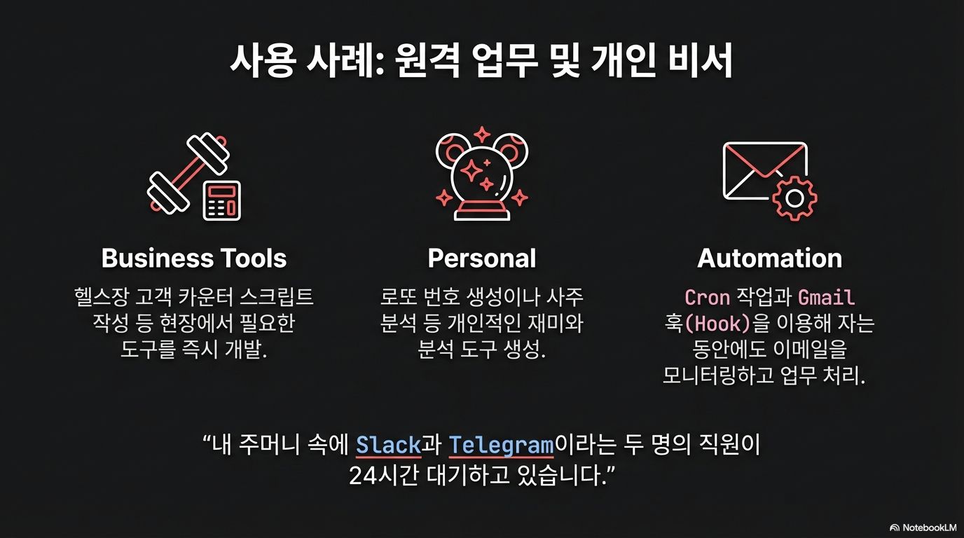 결과물의 속도와 품질은 놀라웠습니다. 외부에서 핸드폰만으로 아이디어를 전달했을 뿐인데, 집 PC가 스스로 작동하여 웹페이지와 게임을 만들어내는 모습은 그야말로 '와우' 팩터 그 자체였습니다. 영상에서는 이를 두고 마치 텔레그램과 슬랙에 각각 AI '직원 둘'을 둔 것 같다고 표현했는데, 이는 결코 과장이 아니었습니다.