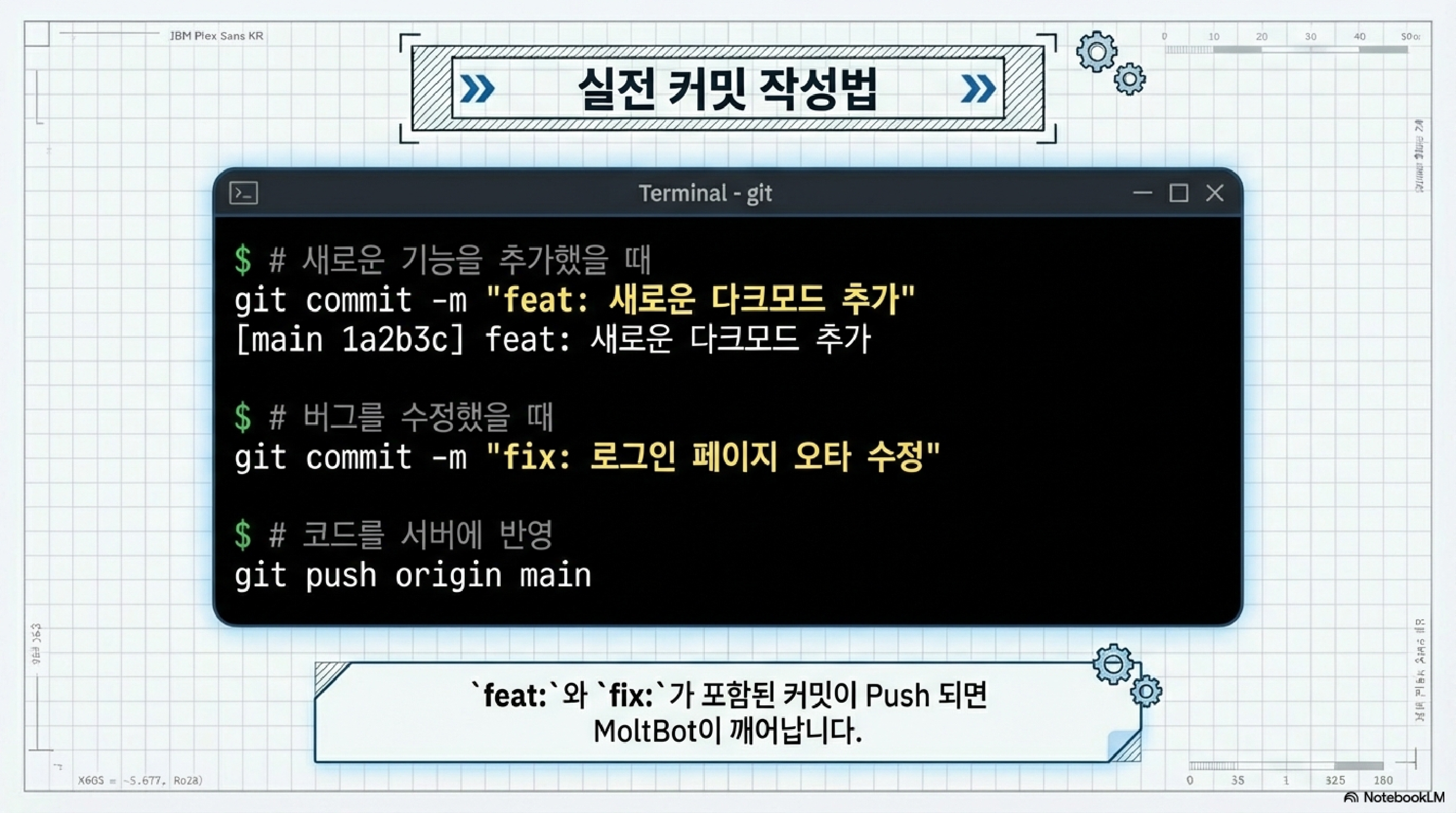 이렇게 정형화된 메시지는 봇이 "이 작업은 기능 추가니까 'Features' 섹션으로 분류해야지!"라고 판단할 수 있는 완벽한 근거가 됩니다.