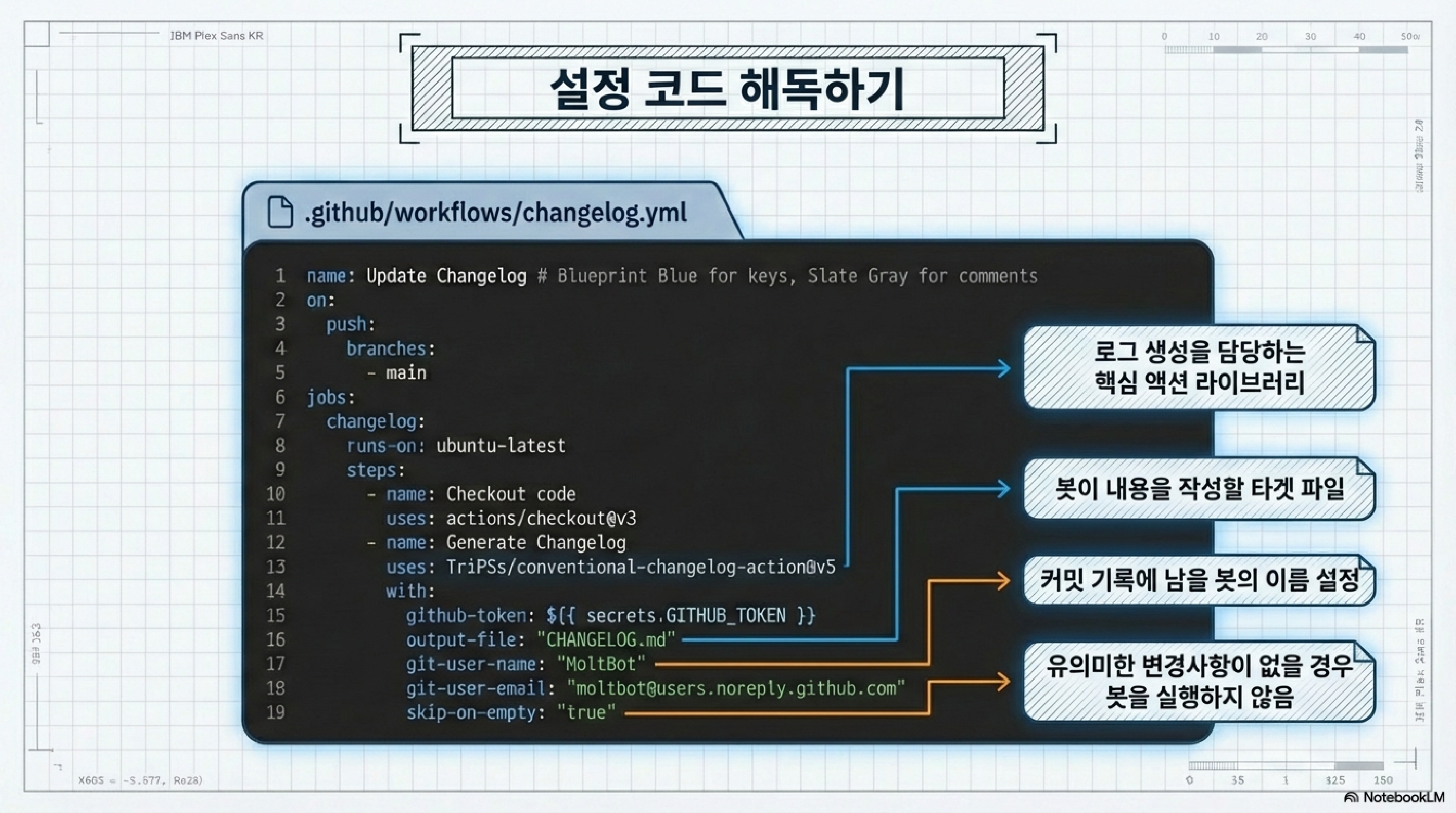 이 단계에서 우리는 사용자의 요청대로 **'MoltBot'**이라는 페르소나를 부여합니다. .github/workflows/changelog.yml 설정에서 git-user-name: "MoltBot"을 지정하면, 봇이 직접 변경 사항을 파일에 기록하고 다시 커밋을 수행합니다.
