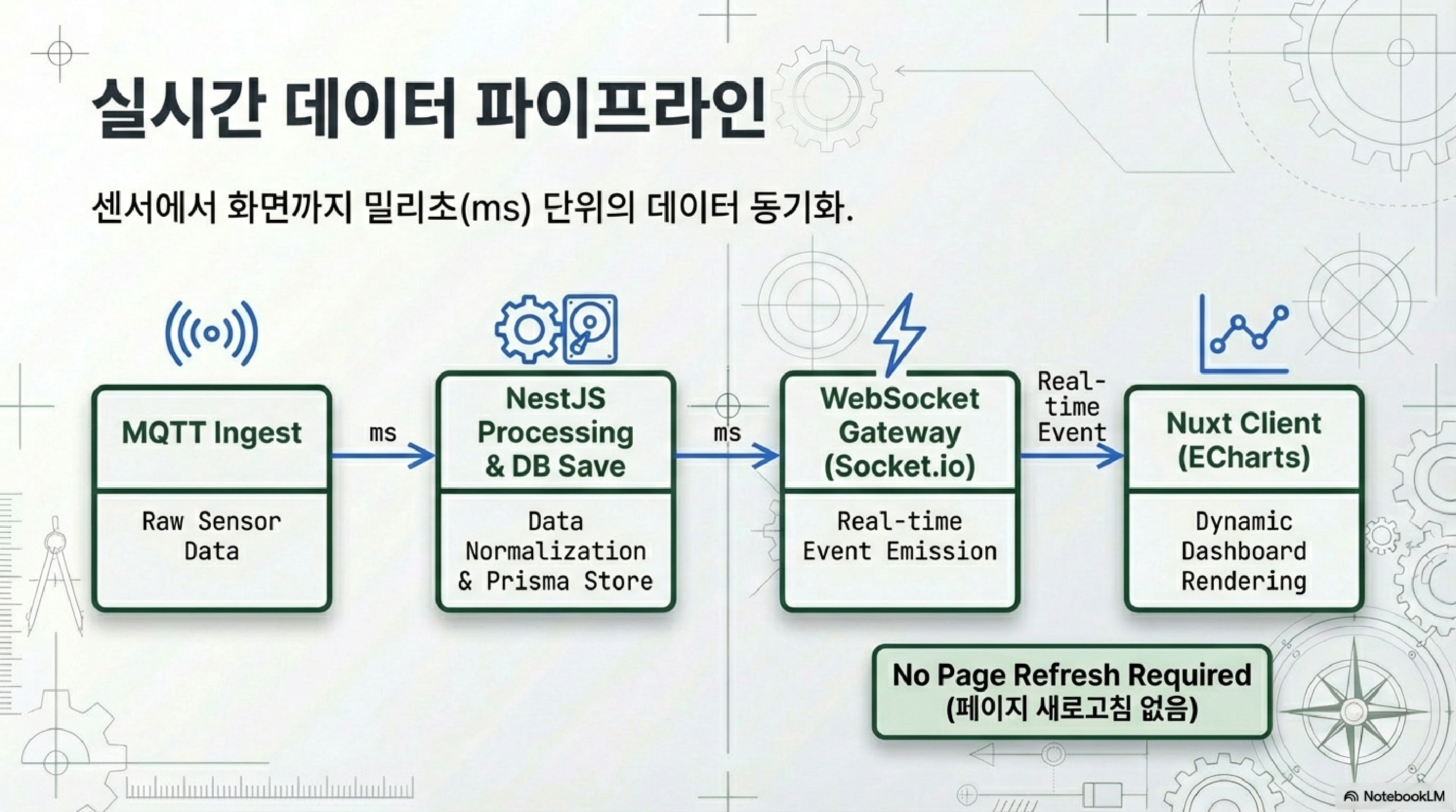 - 백엔드: NestJS + MQTT로 실시간 수집 및 Prisma로 데이터 관리.
