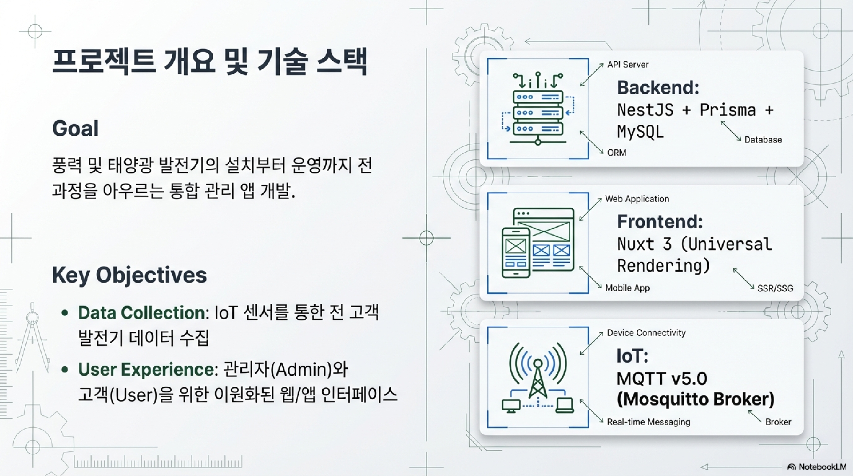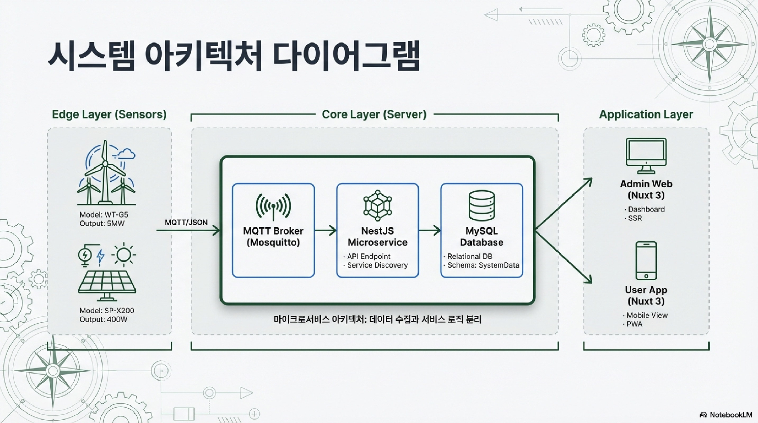 신재생 에너지(풍력, 태양광) 통합 관리 솔루션 구축이라니, 아주 멋진 프로젝트네요! 실시간 데이터 수집이 핵심인 만큼 IoT 데이터 파이프라인을 얼마나 견고하게 설계하느냐가 성패를 가를 것 같습니다.