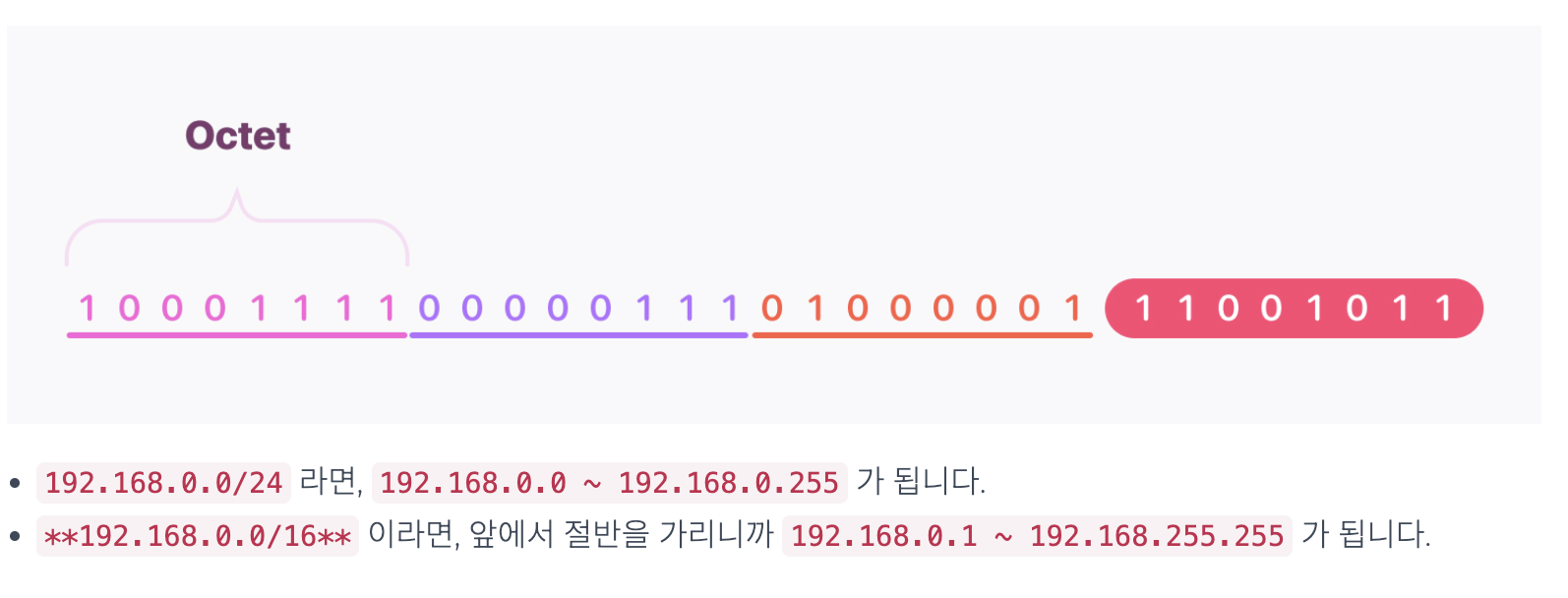 - 192.168.1.0/24: 이 표기법은 192.168.1.0부터 192.168.1.255까지의 IP 주소를 하나의 네트워크로 나타냅니다. 여기서 /24는 서브넷 마스크가 255.255.255.0임을 의미합니다.