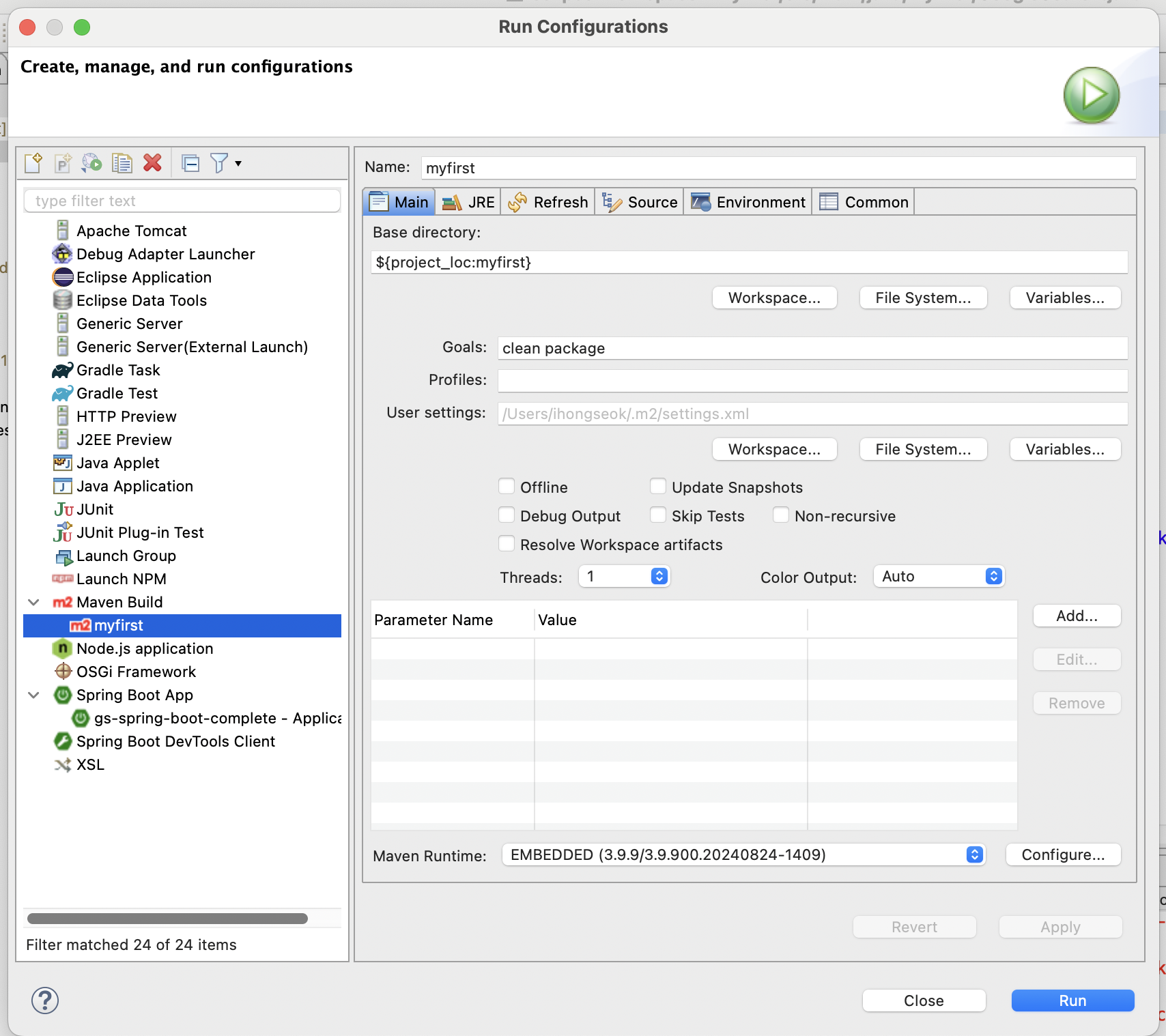 - 또는 Maven Goals 창에서 clean test를 실행하여 프로젝트를 빌드하고 테스트를 실행합니다.