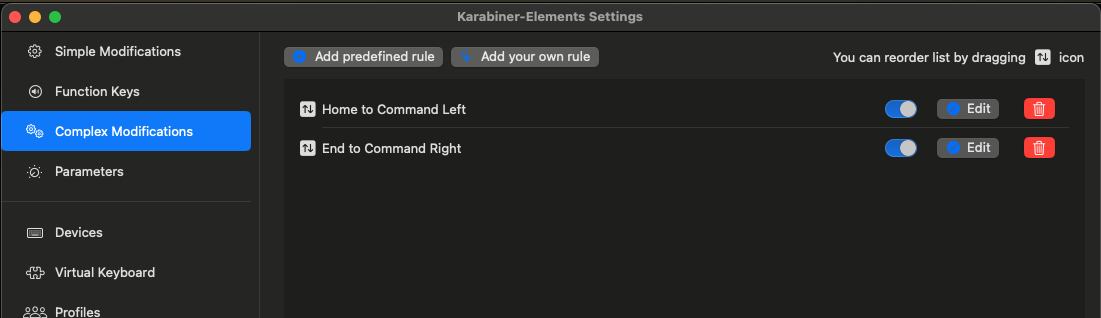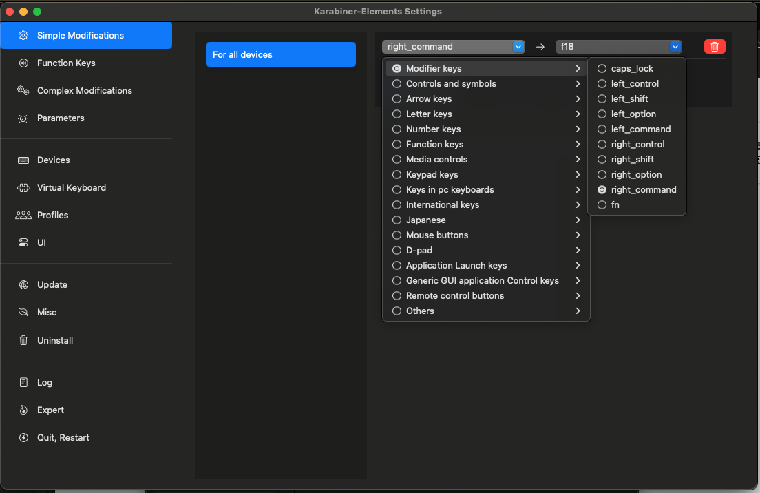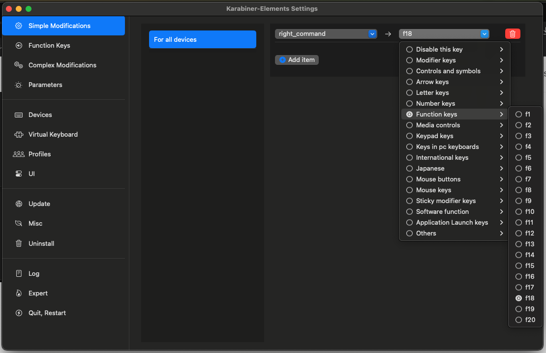 실행하면 아래와 같은 화면이 나타납니다. 좌측 상단에 "Add item"을 선택한 후 상단 From key에는 right_command로 설정하고 To key에는 F13을 선택합니다.