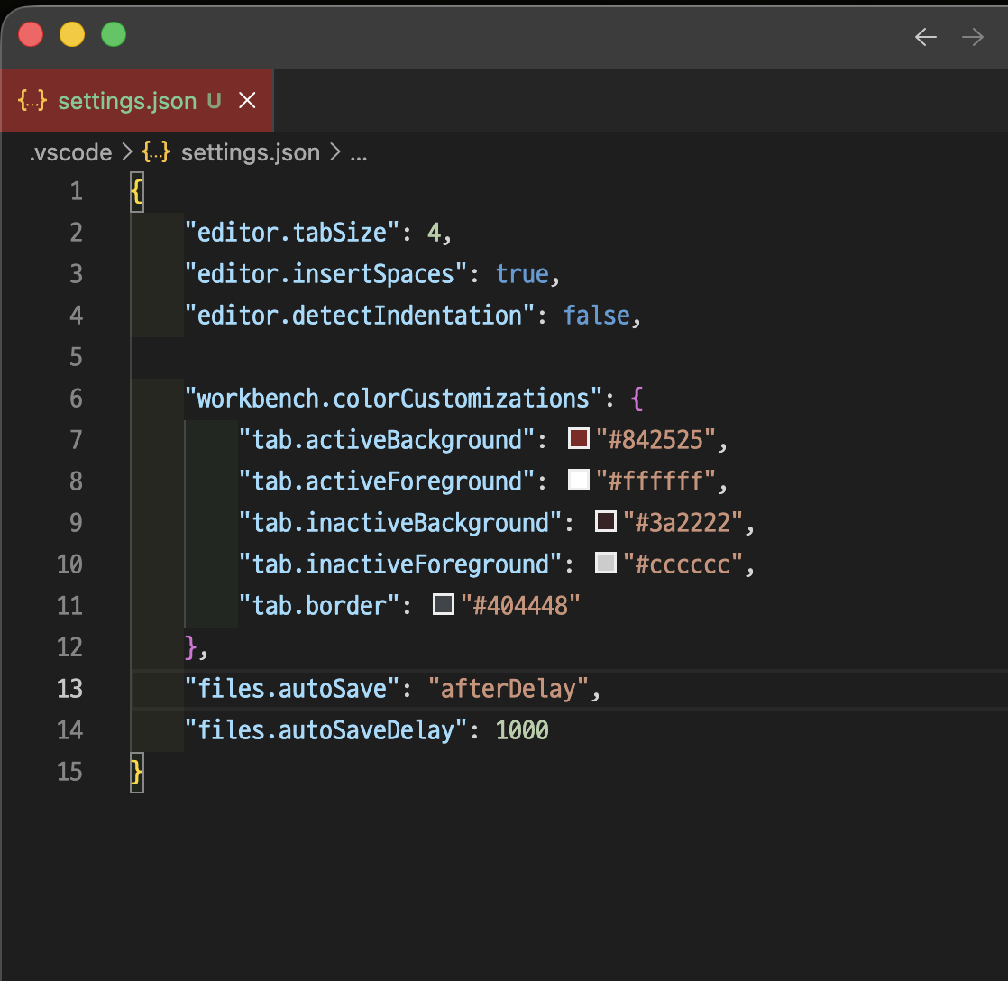 { "editor.tabSize": 4, "editor.insertSpaces": true, "editor.detectIndentation": false, "workbench.colorCustomizations": { "tab.activeBackground": "#254584", "tab.activeForeground": "#ffffff", "tab.inactiveBackground": "#22293a", "tab.inactiveForeground": "#cccccc", "tab.border": "#404448" }, "files.autoSave": "afterDelay", "files.autoSaveDelay": 1000}