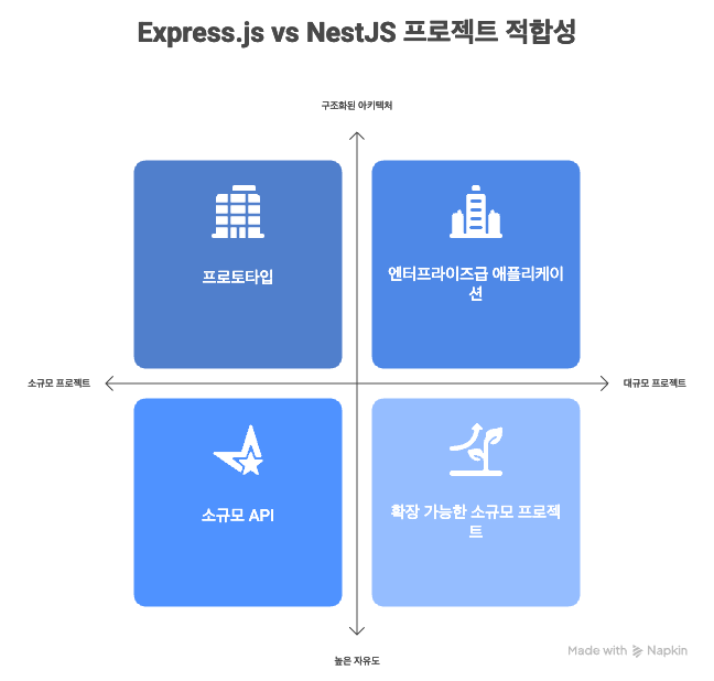 1️⃣ Express.js: 최소주의와 자유로움Express.js는 Node.js 생태계에서 가장 오랫동안 사랑받아온 최소주의(Minimalist) 웹 프레임워크입니다.특징:자유도: 라우팅과 미들웨어 외에는 특별한 구조적 제약이 없습니다. 개발자가 원하는 방식대로 폴더 구조와 패턴을 자유롭게 설계할 수 있습니다.간결함: 가벼우며 빠르고, 진입 장벽이 낮습니다. 소규모 프로젝트나 프로토타이핑에 매우 적합합니다.생태계: 가장 크고 활발한 생태계를 가지고 있어, 거의 모든 기능을 미들웨어 형태로 사용할 수 있습니다.단점:구조 부재: 프로젝트가 커질수록 일관성을 유지하기 어렵고, 코드가 복잡해져 유지보수가 어려워집니다.확장성 문제: 복잡한 엔터프라이즈 기능(DI, 모듈화된 테스트 등)을 구현하려면 서드파티 라이..